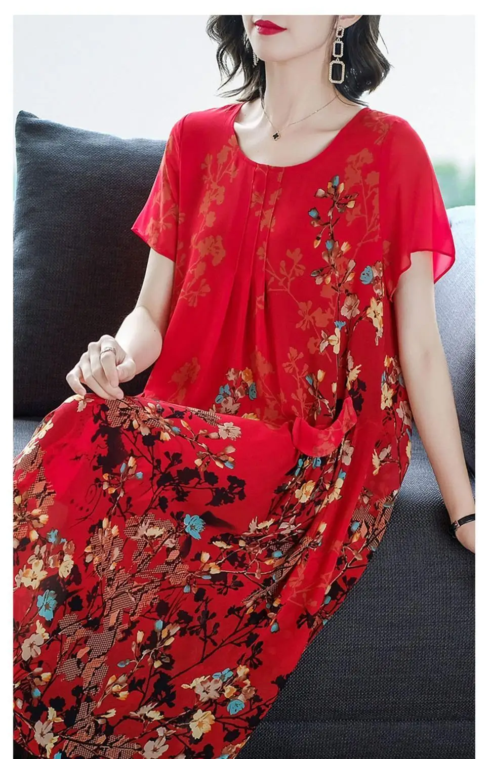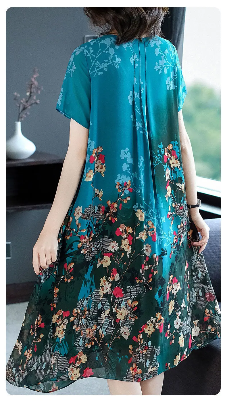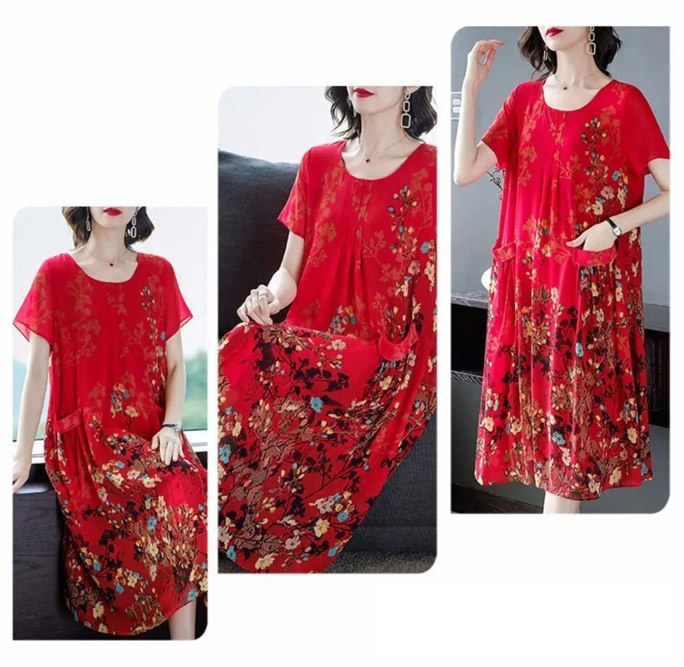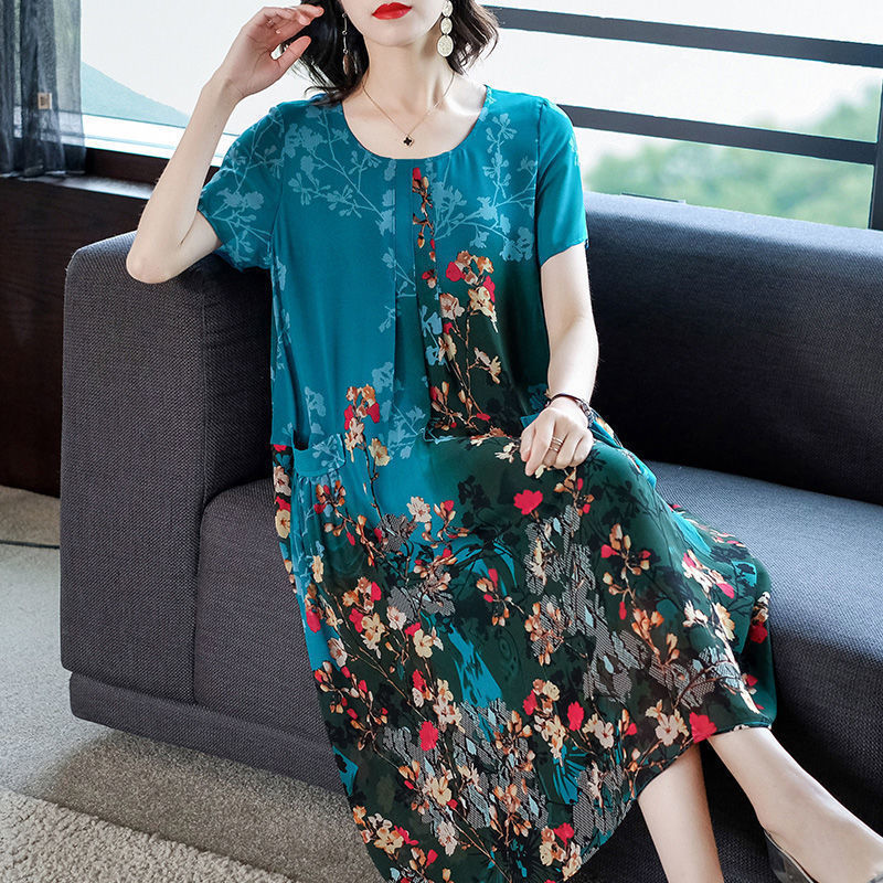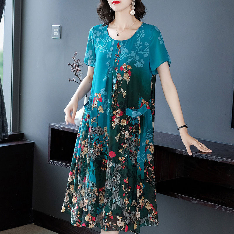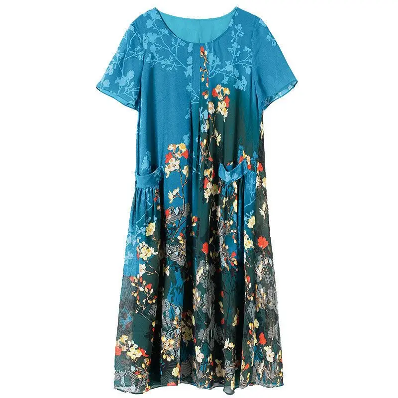 2023 Summer Short Sleeve Casual Stylish Round Neck Dresses Female Folds Floral Printed Commute A-Line Loose Pockets Midi Dress