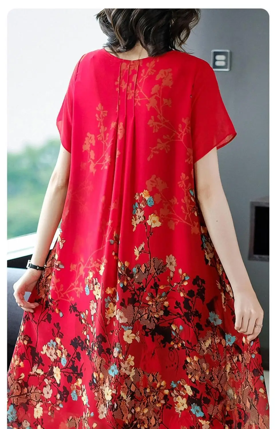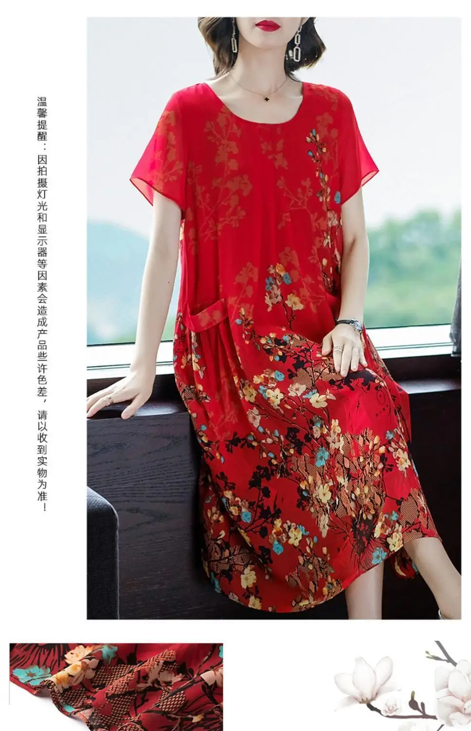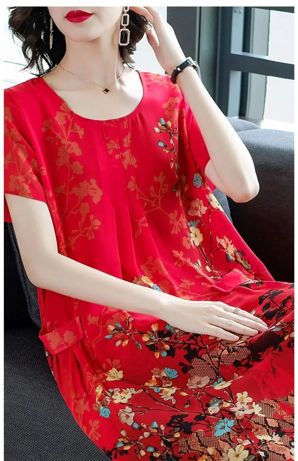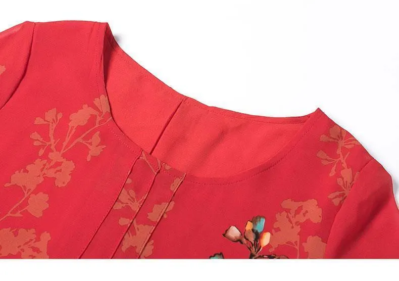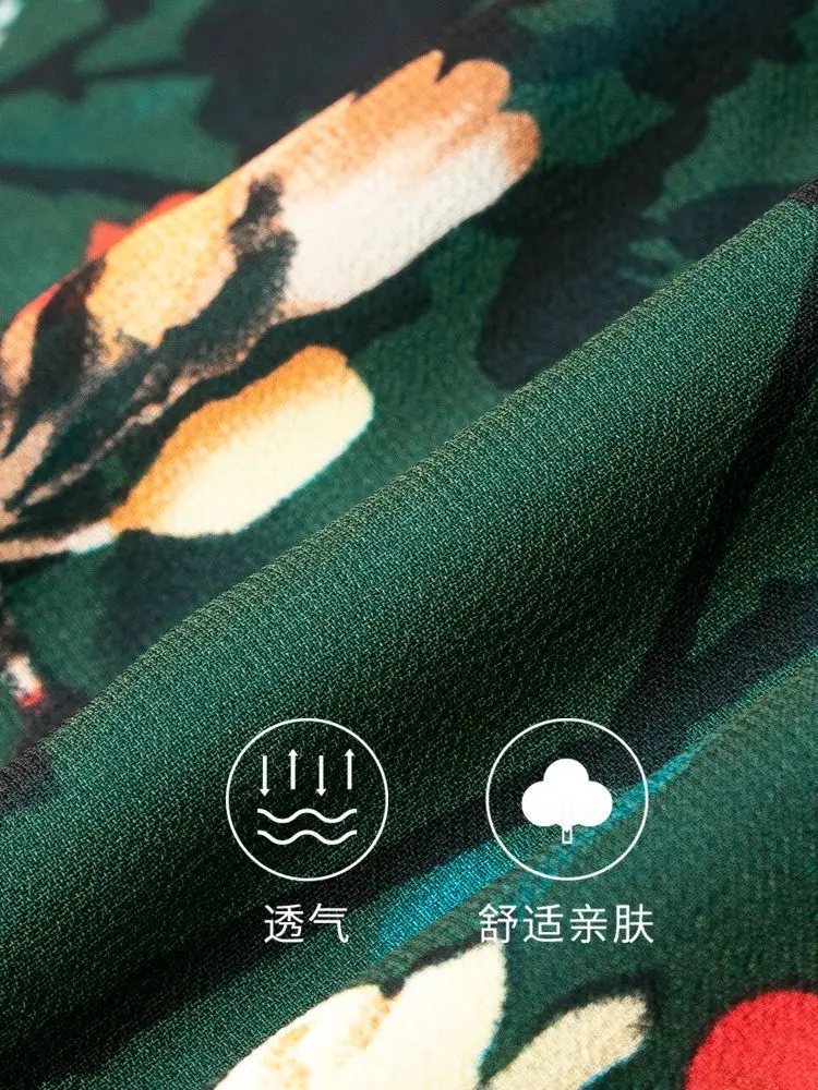 2023 Summer Short Sleeve Casual Stylish Round Neck Dresses Female Folds Floral Printed Commute A-Line Loose Pockets Midi Dress