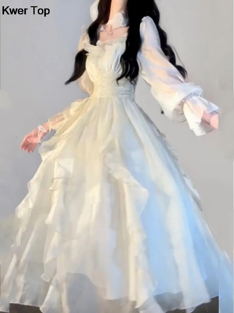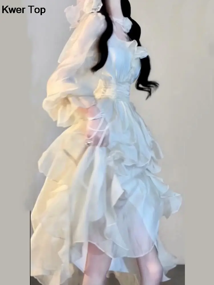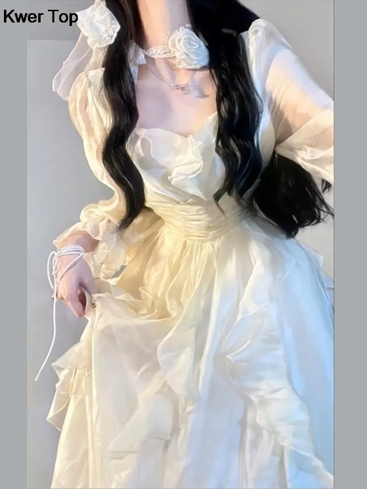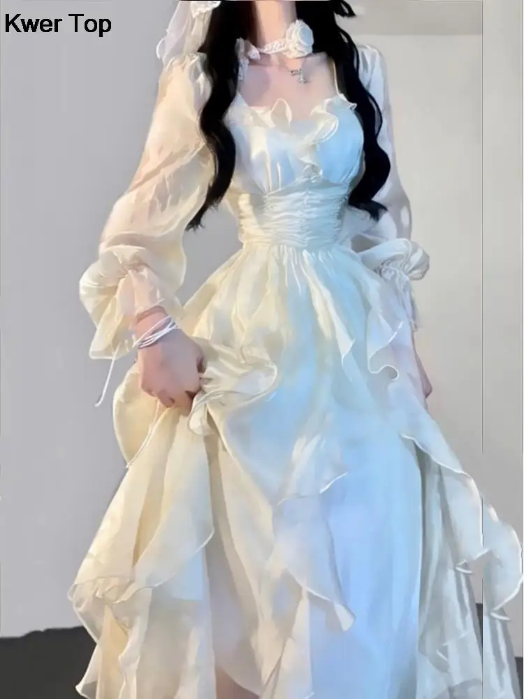Elegant Solid Ruffles Fairy Dresses Korean Fashion Slim Wasit A Line Midi Dress Spring Summer Women Princess Party Vestidos